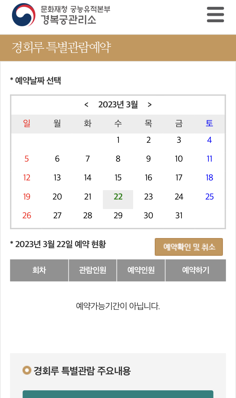 - 예약을 취소하지 않을 경우 추후 경회루 관람이 제한될 수 있습니다.