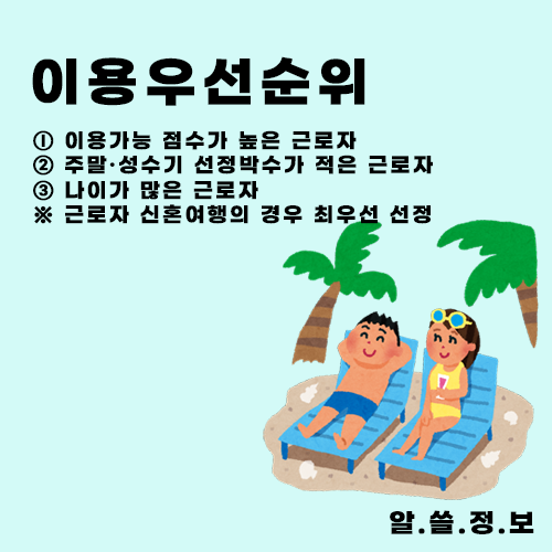이용가능 점수가 높은 근로자, 주말·성수기 선정박수가 적은 근로자, 나이가 많은 근로자가 이용 우선순위이며 그중에서 근로자 신혼 여행의 경우 최우선으로 선정된다고 하네요.