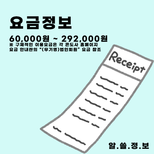 숙소요금은 60,000원 ~ 292,000원대에 이용 가능하며 구체적인 이용요금은 각 콘도사 홈페이지 요금 안내란의 “(무기명)법인회원” 요금 참조하시길 바랍니다.