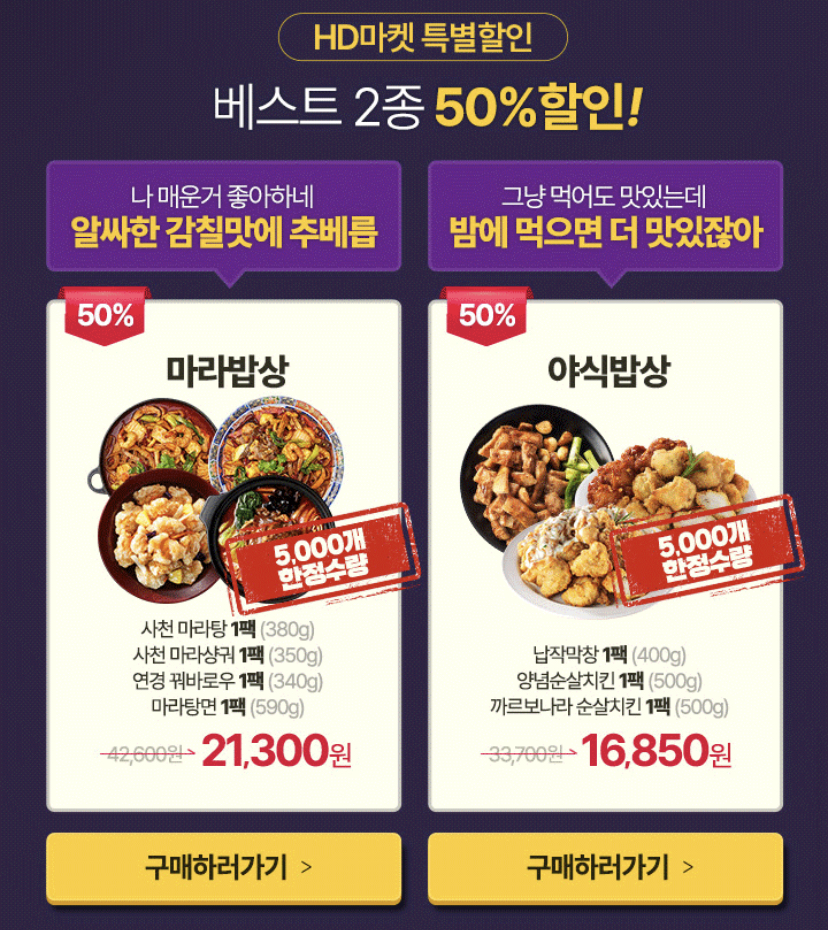 예시 1) 한식밥상 3개 + 마라밥상 3개 = 구매가능