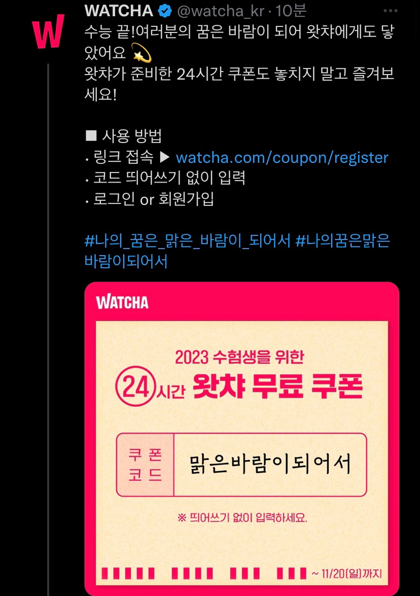 마감_왓챠 24시간 무료쿠폰_수능 필적란 문구(~11.20)