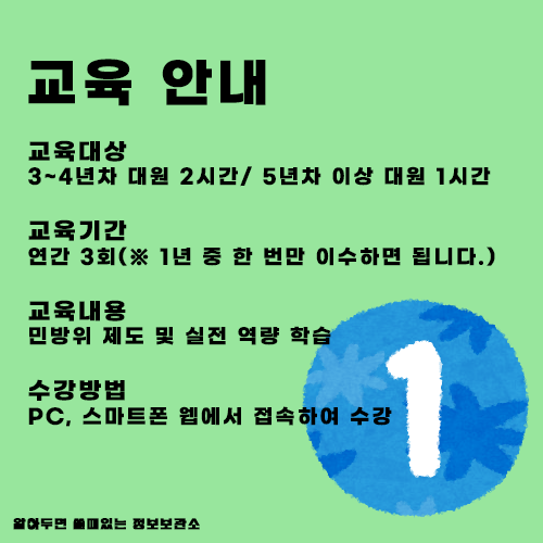 안녕하세요. 오늘은 민방위 사이버교육에대해 자세히 알아보도록 하겠습니다. 교육 내용은 민방위 기본소양, 안보, 화생방, 응급처치, 지진 및 화재 대비등입니다. 이를 통해 교육과 체험 실습으로 민방위 사태 발생 시 즉각 대처할 수 있는 능력을 함양시킬 수 있습니다.