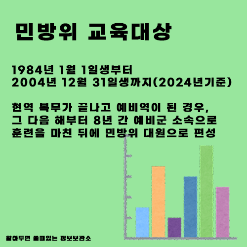 민방위 교육 대상은 2024년도 기준 1984년 1월 1일생부터 2004년 12월 31일생까지 해당됩니다.