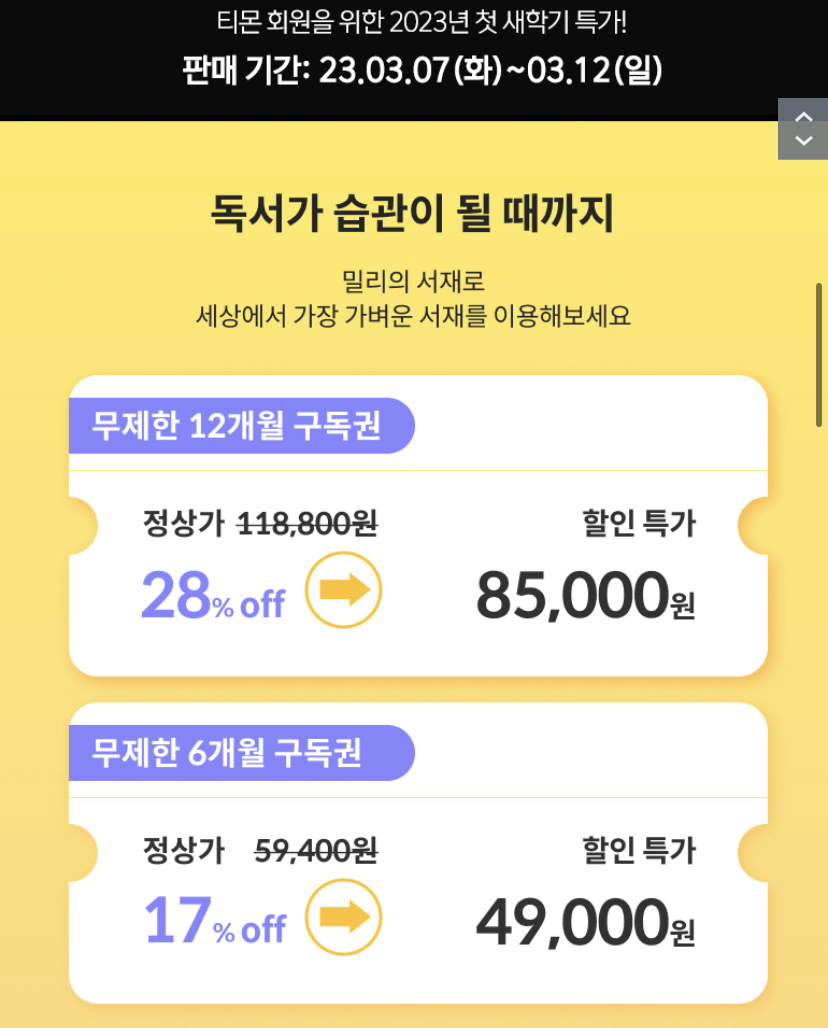 티몬이나 위메프 같은 곳에서 분기별로 이런식의 6개월 구독권이나 1년 구독권을 할인합니다. 이는 밀리의 서재말고 북클럽도 종종할인하는데 꾸준히 이북을 이용하실거면 이런식으로 6개월, 1년 단위의 구독권을 구매해서 이용하는 것이 훨씬 이득입니다.
