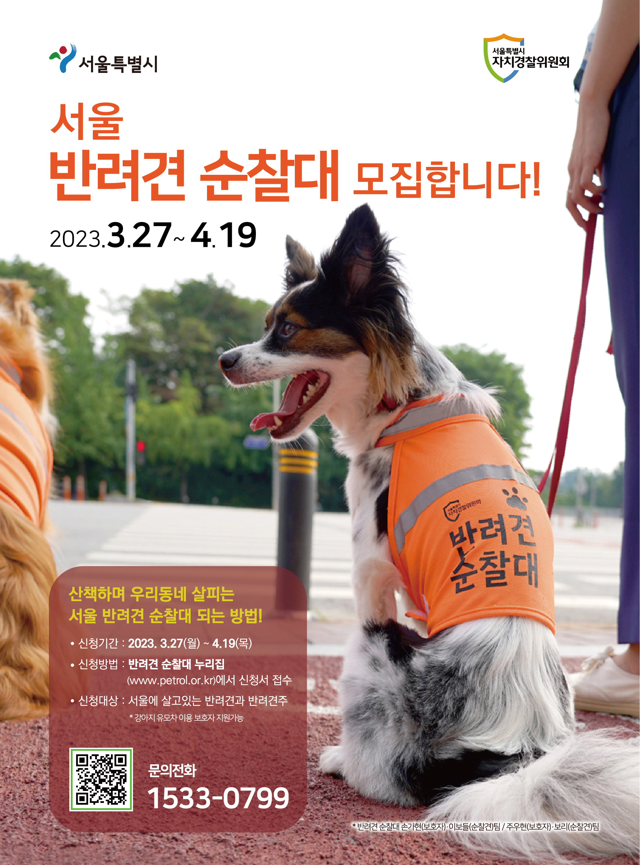 이런 반려견 순찰대가 좋은 효과를 가져오자 순찰대 운영을 확대할 계획이라고 하죠. 이번엔 서울시와 부산시에서 2기 순찰대를 뽑는다고 합니다.