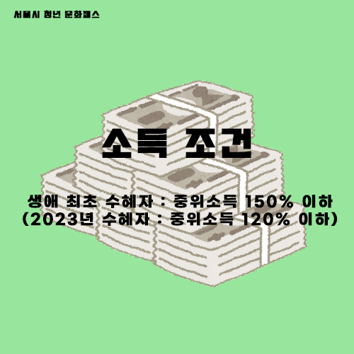 소득 조건은 생애 최초 수혜자의 경우 중위소득 150% 이하여야하며 2023년에 수혜를 받은 청년중엔 중위소득 120%이하여야 소득 요건을 충족 시킬 수 있습니다. 신청시 기재한 개인정보와 개인정보제공 동의를 통해 주민등록사실여부 (연령 및 서울 거주) 및 건강보험료 부과내역(중위소득 150% 이하) 확인을 거쳐 대상자 선정하며, 본인이 납부하고 있으면 본인납입 건보료 기준, 본인이 피부양자로 되어 있으면 부양자 납입 건보료 기준으로 선정하게 됩니다.