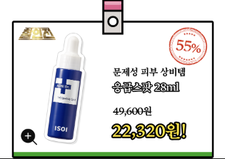 그외에도 이런식으로 세럽이나 스팟 하나만 구매할 수 있는 개별 제품도 있습니다. 첫번째 구성이 할인율이 가장 높지만 안 사용하는 제품이 들어있을 경우에 굳이 살 필요가 없다면 이 제품이 좋을 것 같습니다. 잡티 세럼과 응급스팟은 올리브영 할인때도 많이들 쟁이는 제품이라 지금 구매해도 좋을 것 같아요. 이 제품들 외에도 할인하는 제품들도 있는데 밑에 아이소이 배너 달아드리겠습니다.