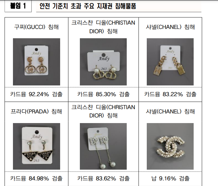 이외에도 명품을 카피한 지식재산보호권을 침범하면서 동시에 유해물질이 검출된 사례도 24개 제품 중 20개(83%)에서 카드뮴이 검출됐으며, 그중 3건은 기준치를 초과하는 납도 함께 검출되었다고 합니다.