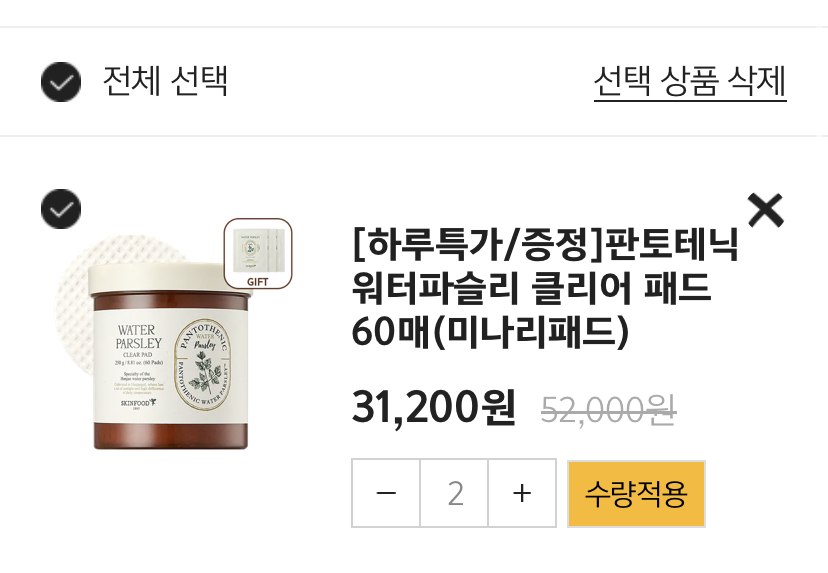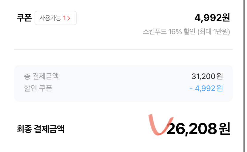 두 개 구매하면 31,200원인데 화장품이 많아서 다른 걸 추가로 살 계획은 없어서, 스킨푸드에서 주는 할인 쿠폰은 적용이 안되더라고요. 그래서 페이코 추가할인만 받게 되었습니다.