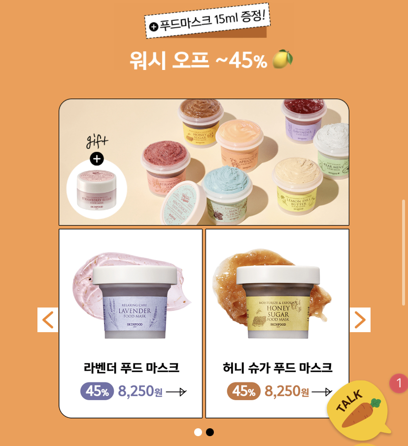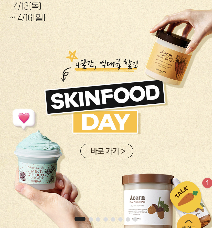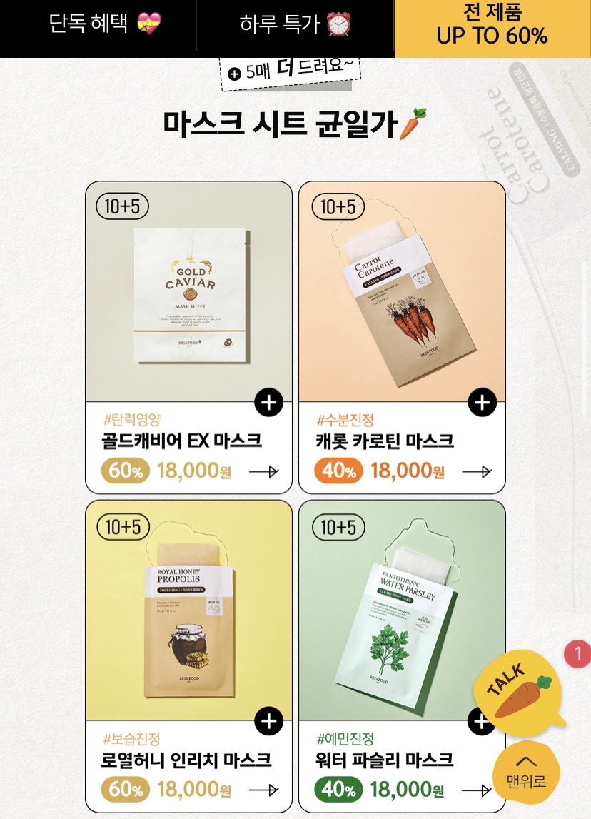 제일 할인율이 큰 건 마스크팩 같아 보이는데 많이 할인되는 제품들은 최대 60프로까지 할인이 되는 것 같네요. 스킨푸드 마스크팩은 저도 아직 사용해보지 않아서 궁금합니다.