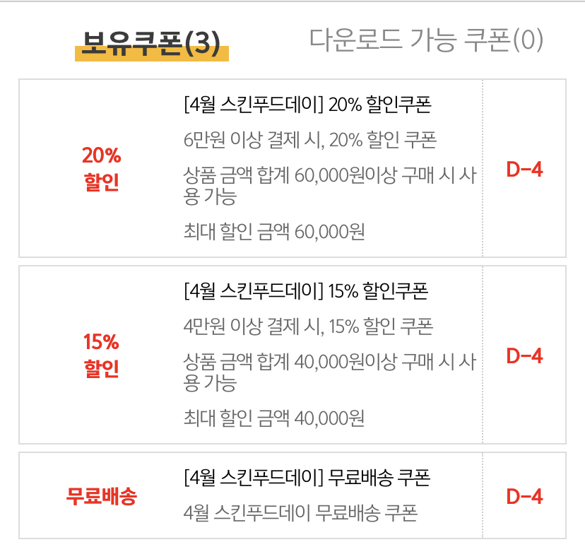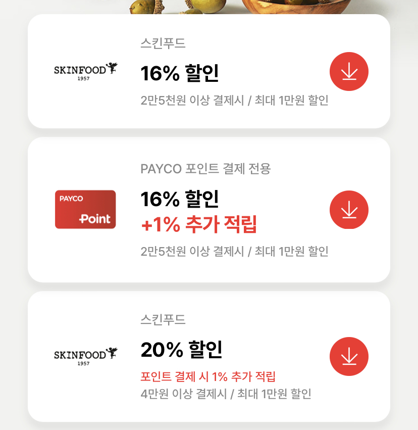 페이코앱을 받으시고 검색창에 스킨푸드를 검색하시면 할인쿠폰이 나오는데요. 2만 5천 원 이상 구매 시 16프로 추가 할인이 되고(포인트 결제 시 추가 적립), 4만 원 이상 구매 시 최대 만원 20프로 추가 할인이 적용됩니다.