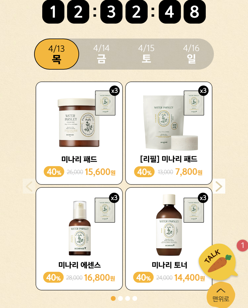 최대 60프로까지 세일하고, 매일 타임특가가 있다고 하네요. 특가라인은 잘 보니 인기 많은 미나리패드부터 당근패드까지 패드라인이 모두 들어가 있는데요.
