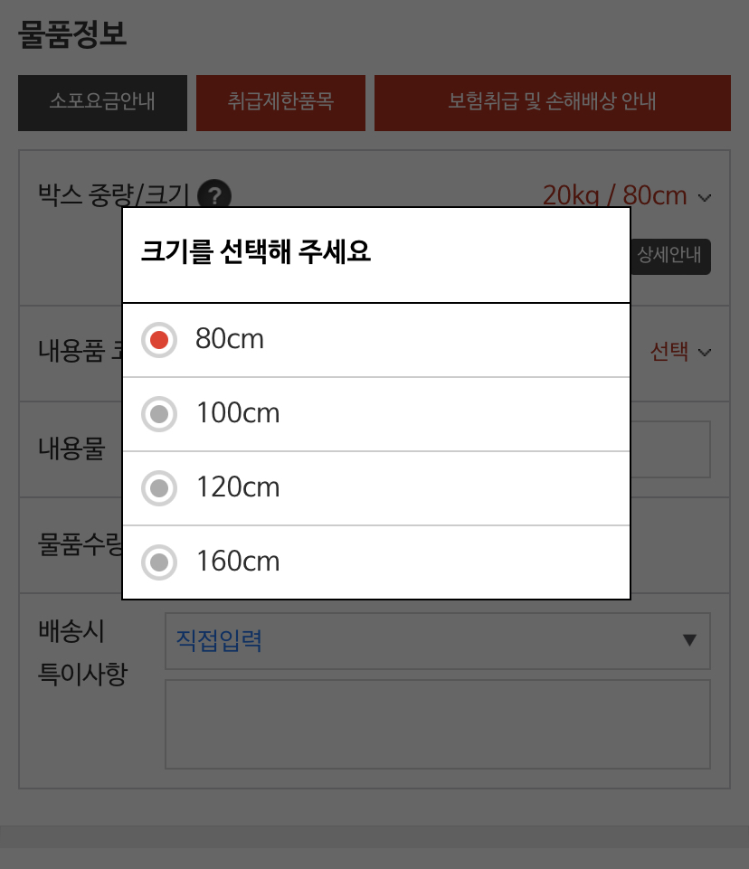 그후에 중량과 크기를 선택하는데 박스 크기 같은 경우는