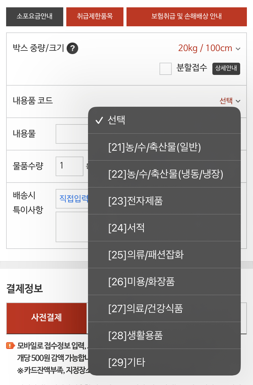 택배 하나당 500원이 감액 가능하니 내가 지불하는 방식이면 모바일 - 사전 결제를 추천한다. 모바일 사전 결제 방법은 매우 쉽다.