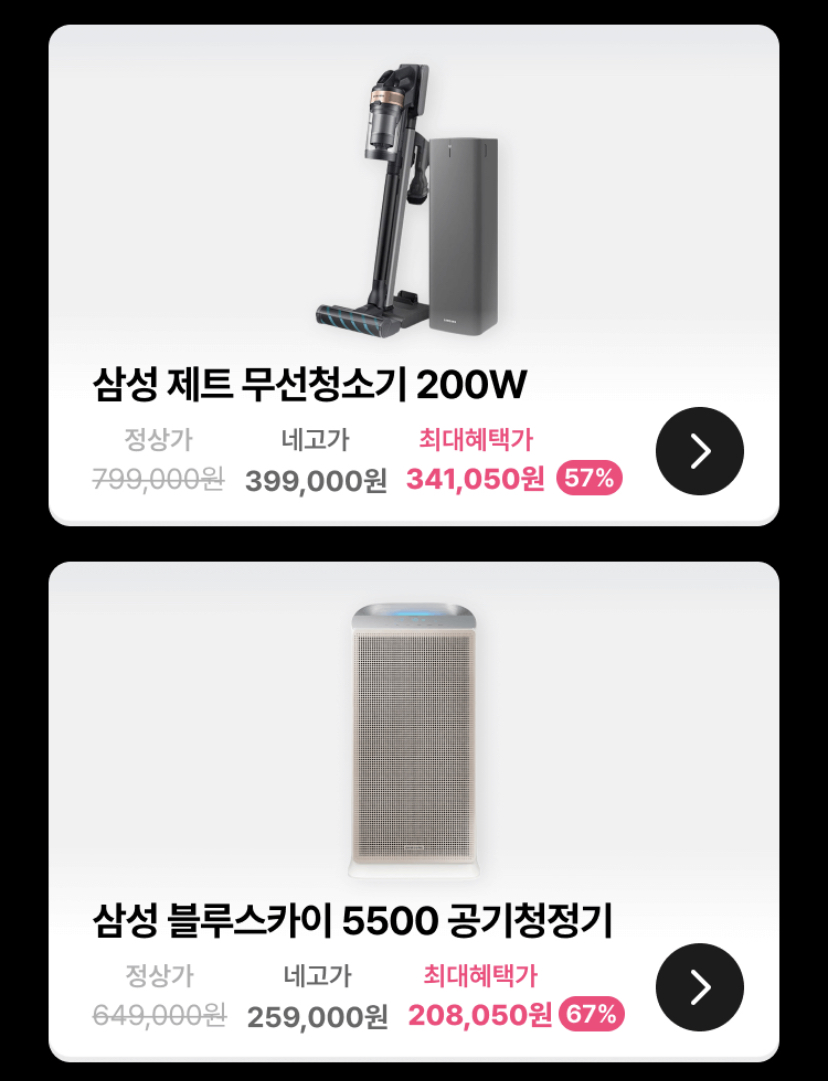 1. 삼성전자 제트 무선청소기 = 399,000원