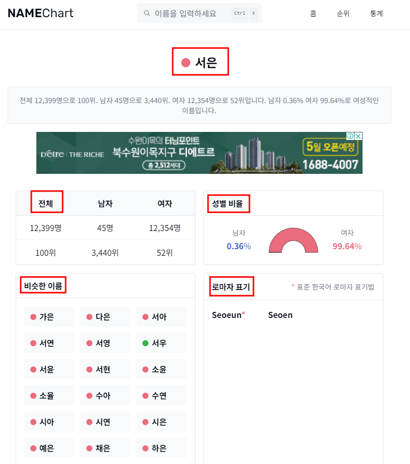 네임 차트라는 사이트인데 이곳에 생각해둔 아이의 이름을 검색하면 위처럼 정보가 나옵니다. 예를들어 서은이라는 이름을 검색하니 여자가 99.64% 비율을 차지하고 있고 전체중 12,399명이 사용하는 이름이라고 하네요. 여자아이 사용 비율이 높은 만큼 전체 순위에서 52위를 차지하고 있는 것으로 보입니다. 그외에 비슷한 이름도 추천해주고 로마자 표기도 해주니 이래저래 유용한 정보를 한눈에 볼 수 있어 좋은 사이트인 것 같습니다. 네임차트라는 사이트를 검색하시거나 못찾으시는 분들은 밑에 배너를 이용하셔서 이름 짓는데 참고하셨으면 좋겠습니다.