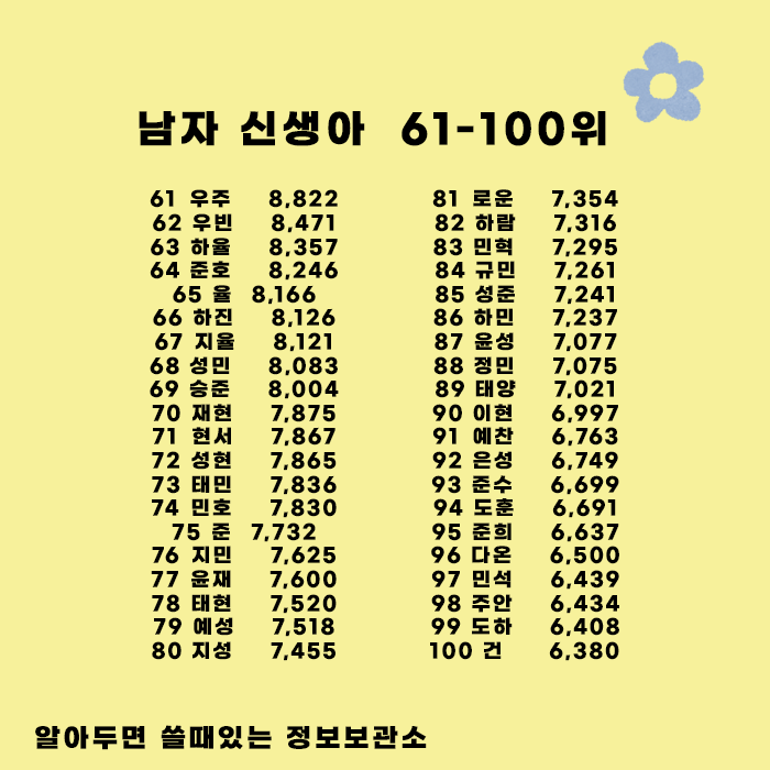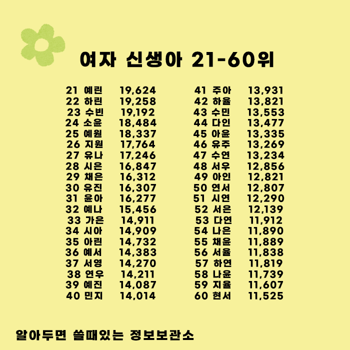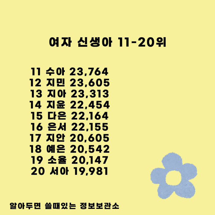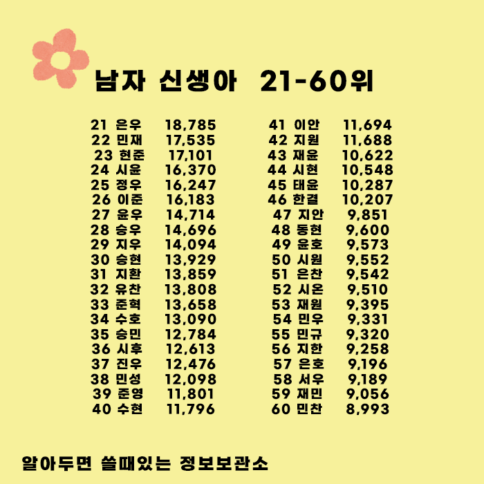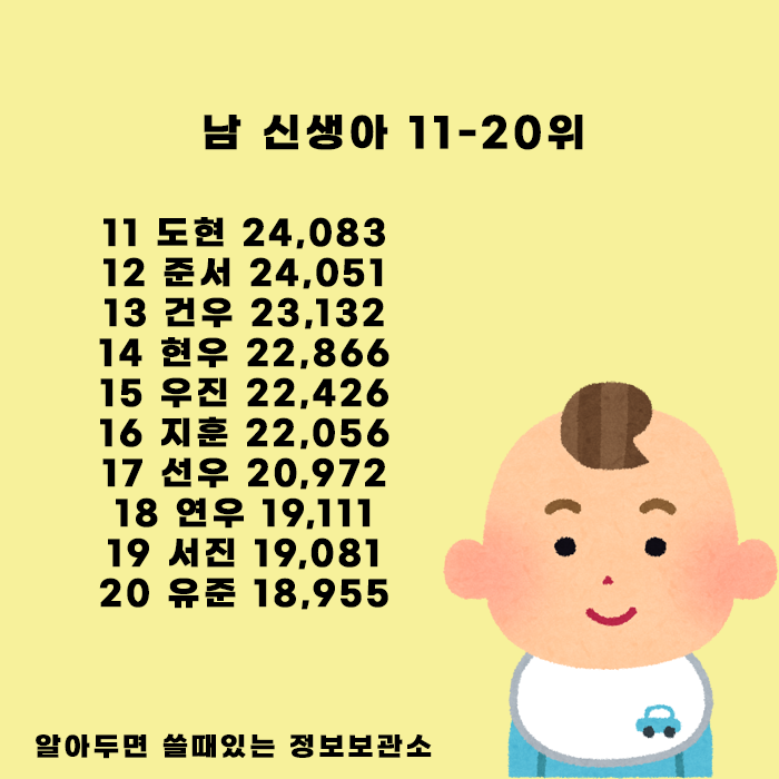 아이 이름 지을때 흔하지도 그렇다고 너무 특이하지도 않은 이름을 골라야할텐데 가장 인기 많은 이름들을 참고해서 지으시면 좋지 않을까 생각됩니다. 또한 신생아 이름 순위 보는 것뿐만아니라 아이 이름으로 생각하고 있는 것중에 검색하여 남자 여자 아이 비율및 전체 비율등을 세세하게 볼 수 있는 사이트도 있던데 이곳을 참고하시는 것도 좋을 것 같습니다. (홍보x 글쓰면서 알게된 곳입니다.)