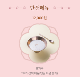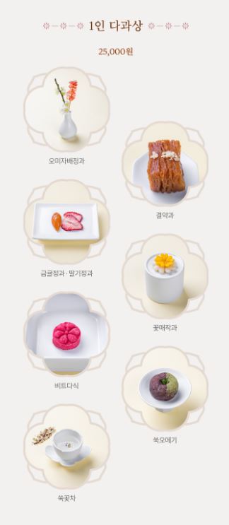 - 1인 다과상 차림으로 제공되며, 단품 메뉴는 추가 선택 가능합니다. 단품 메뉴는 단일 이용이 불가합니다.