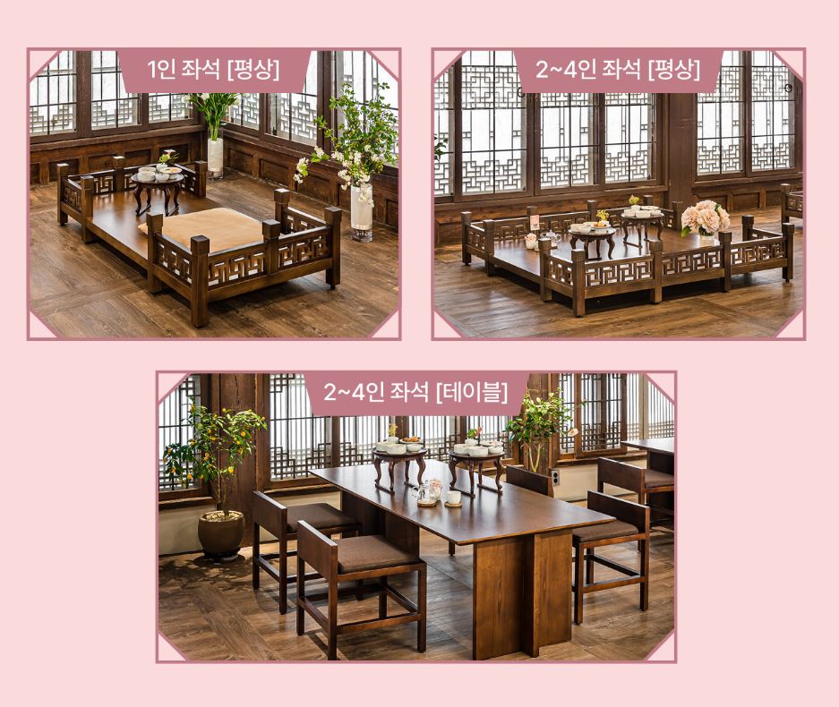 - 좌식 공간은 1인 또는 2~4인 예매 가능하며, 입식 공간은 2~4인 예매 가능합니다.