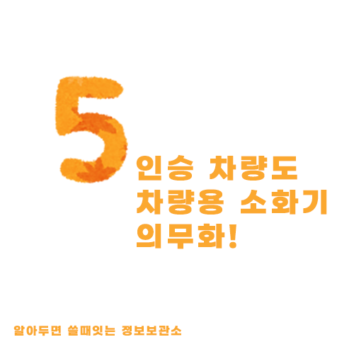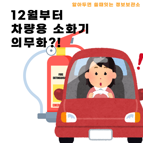 12월부터 5인승 이상 자동차에 차량용 소화기 설치가 의무화 된다는 것 알고 계신가요? 만약 자동차에 소화기가 설치되어 있지 않다면 어떻게 되는걸까요. 바뀌는 차량용 소화기 법률에 관해 알아봅시다.