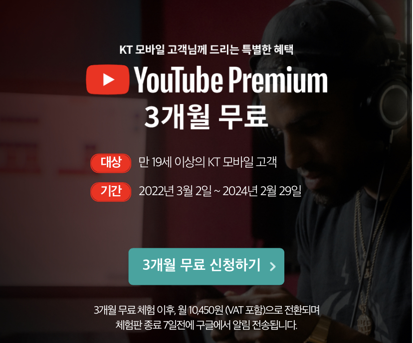 오늘은 KT 통신사의 유튜브 프리미엄 3개월 무료체험에