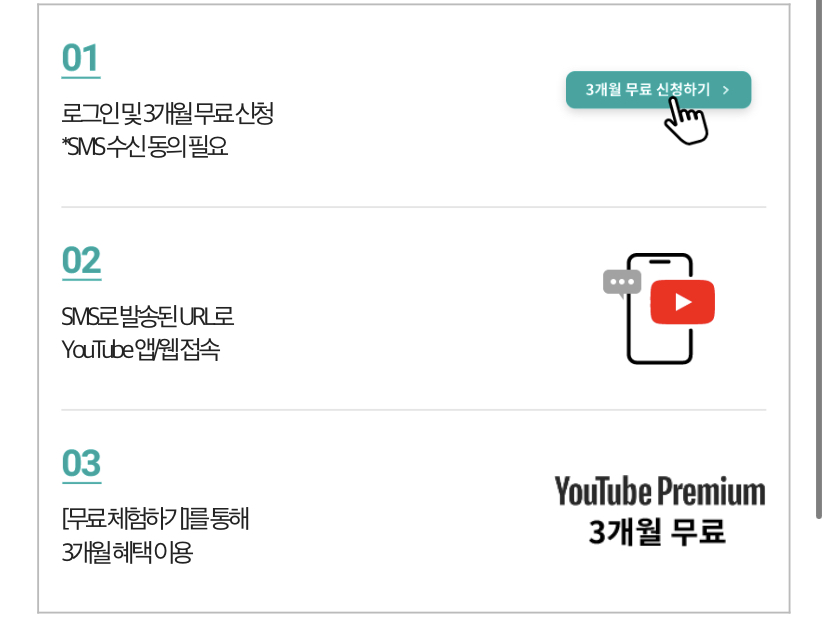 이때 *SMS수신동의가 필요하다고 하네요. 그 후 SMS로 발송된 URL로 유튜브 앱이나 웹에 접속하신후 무료체험하기를 통해 삼개월 혜택을 이용하시면 되는데요.