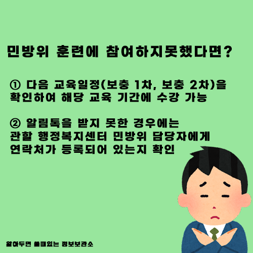 또한, 민방위 교육은 연 3번의 교육기간이 있으며 연 중 1번만 이수하면 과태료가 부과되지 않습니다. 최종 교육기간 내에도 이수하지 못한 경우에는 관할 행정복지센터 민방위 담당자에게 문의해 주시면 됩니다.