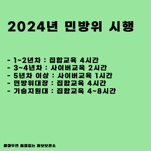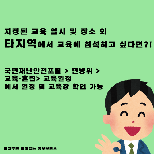 이외에도 궁금한점이나 지역별 정보를 확인하시고 싶다면, 아래의 민방위 사이버교육센터를 참고하시길 바랍니다.